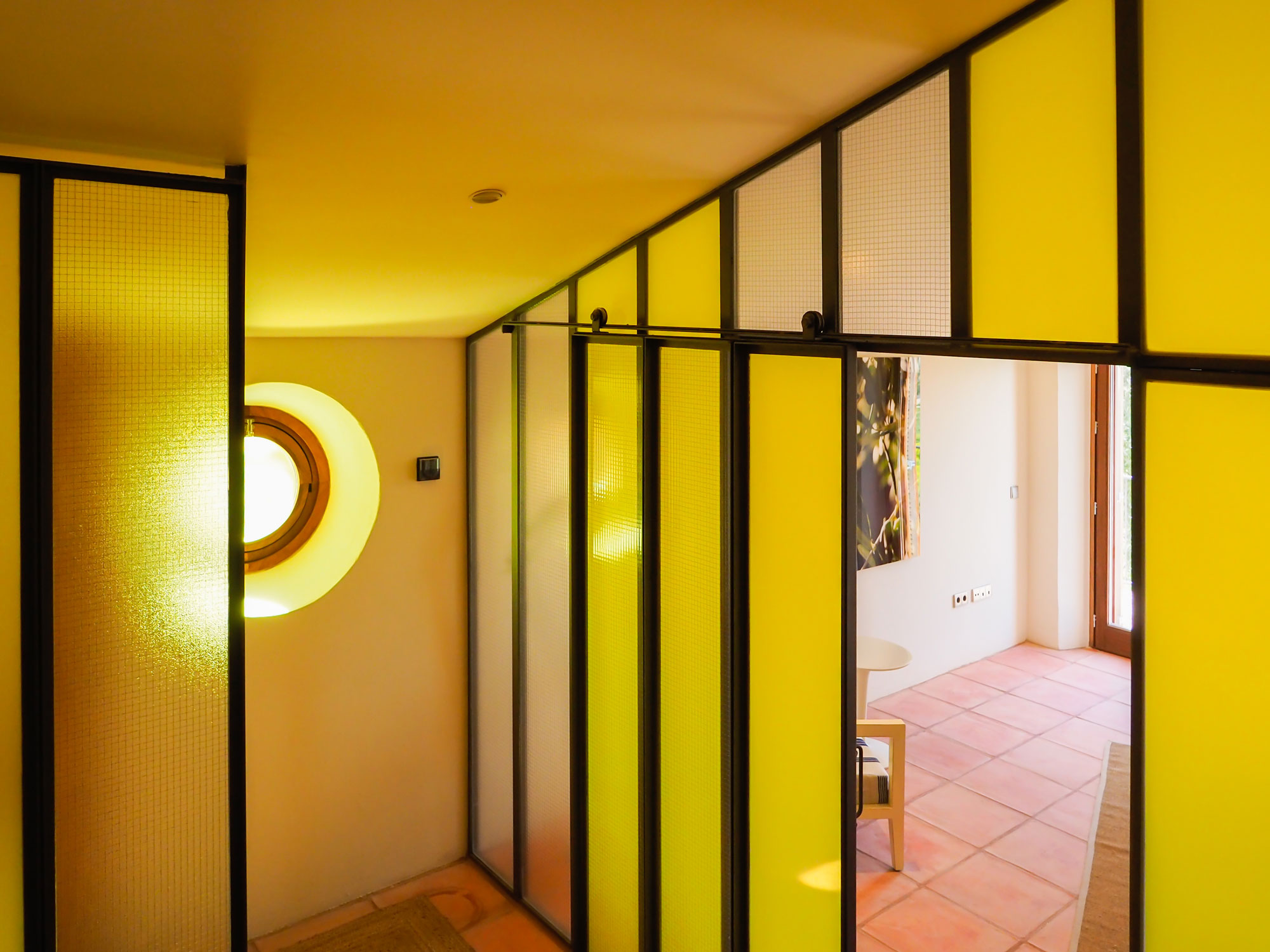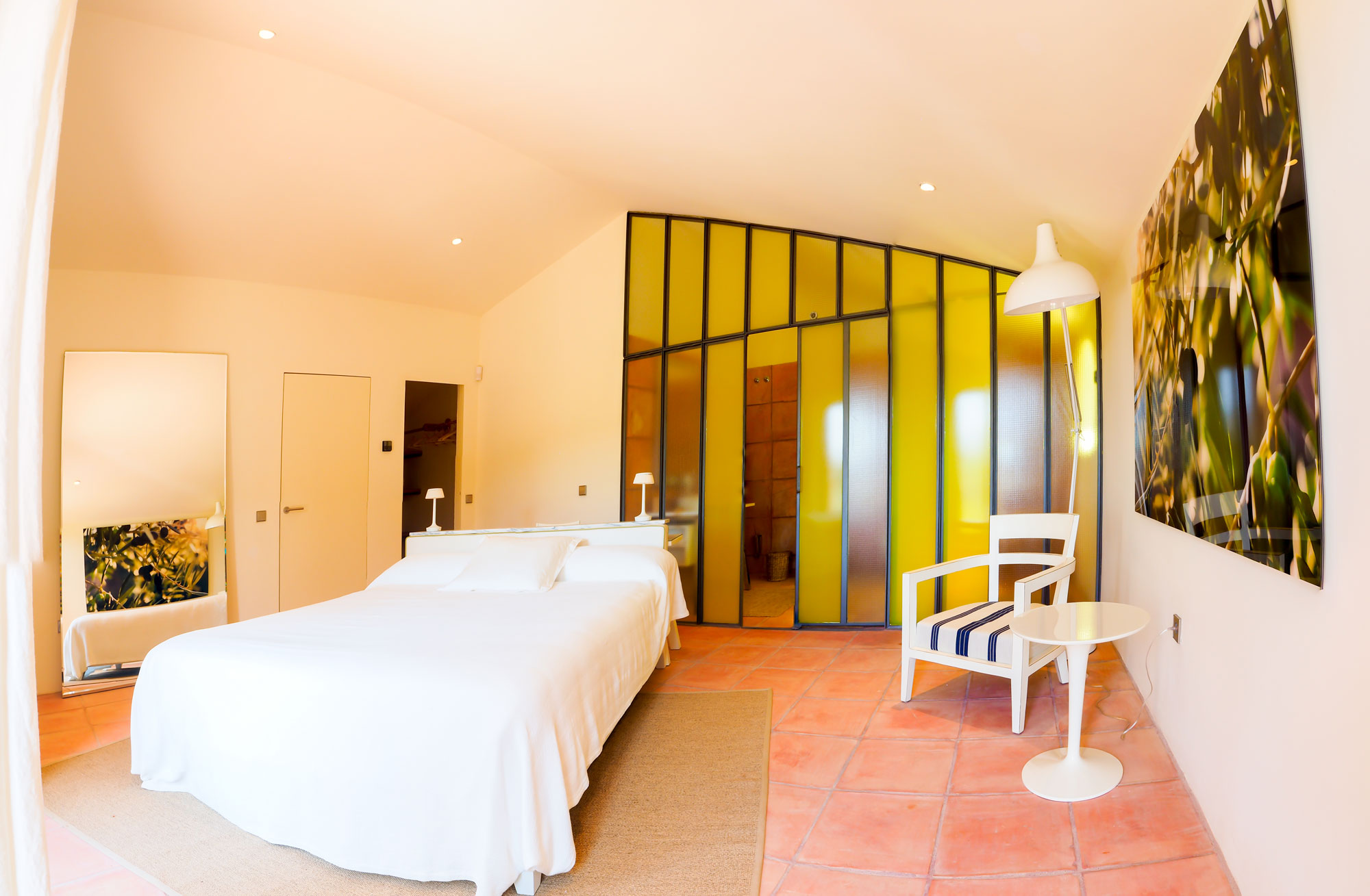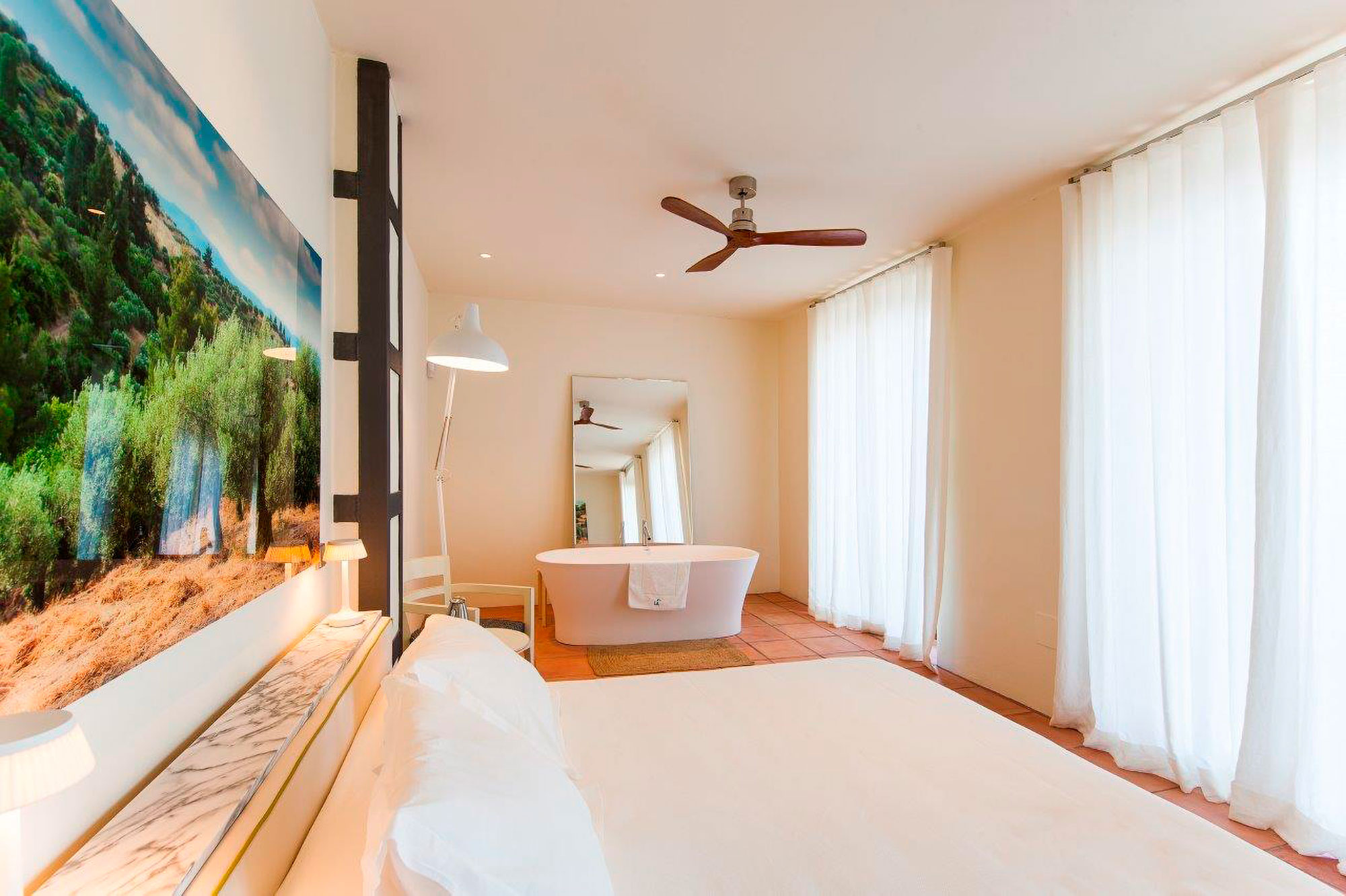 Espacio de gran amplitud dentro del Cortijo, con cama king-size y zona de descanso adicional. Baño privado en suite con acabados de diseño, climatización independiente y ventanales, terraza privada con vistas a la finca y a la Serranía.