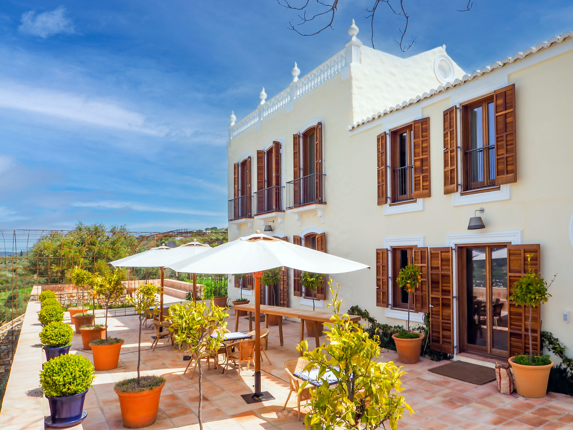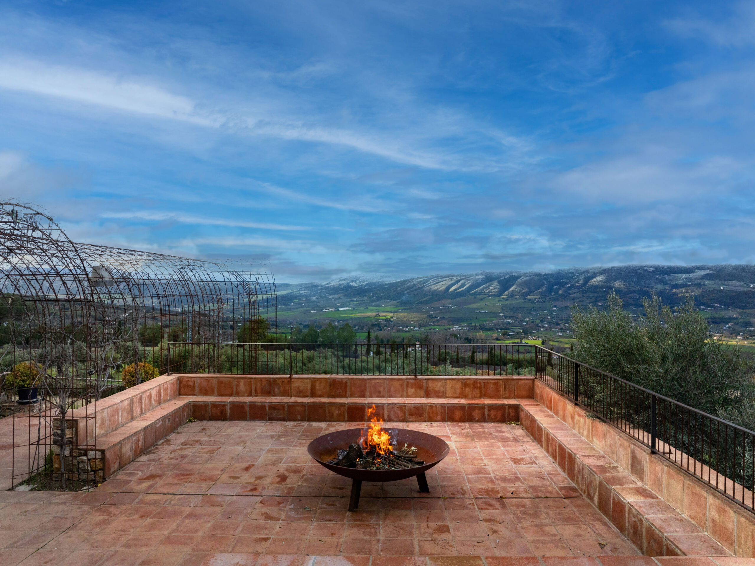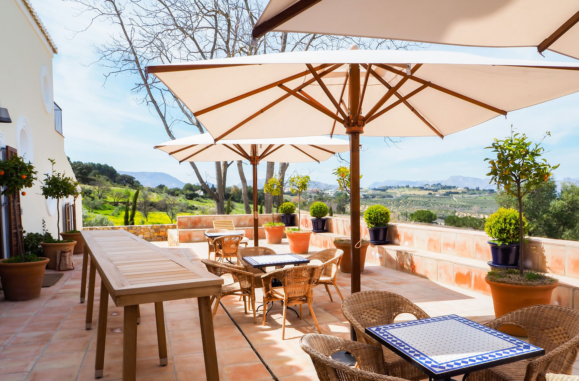 El porche/terraza de 150 m² ofrece impresionantes vistas a la finca y a la Sierra de Grazalema, además de diversas zonas de descanso. Ofrece un ambiente familiar y privado, y la posibilidad de disfrutar de un desayuno tranquilo o contemplar una impresionante puesta de sol mientras se degusta un vino típico de la zona. Cortijo LA Almazara es el lugar perfecto para organizar unas vacaciones en familia o una escapada romántica con vistas a uno de los lugares más bellos de Andalucía.